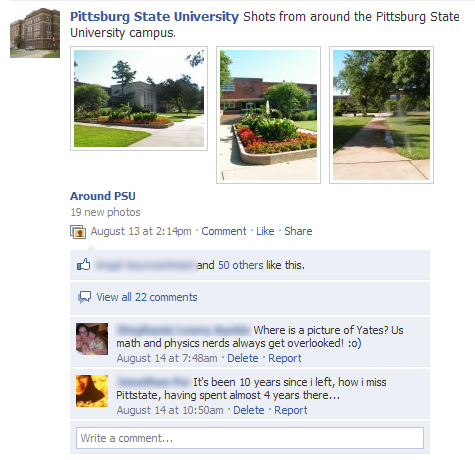 Interesting post. We experience the same thing with the Univeristy of Minnesota Facebook page. Posting pictures of campus landmarks and traditions tends to generate some of the most commented and “liked” status updates. I think its a great way to bring our school’s community (alumni, students and the general public) together.