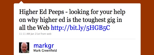 Nice post. I think another problem is the lack of consistency in web roles. Everybody seems to have a different idea of what a web person is, what they ought to do and so forth. I mean, if you’re an SID, you’re an SID and if you’re an admissions person, things are different and yet not so different that you’d feel like you were working in a completely different field.