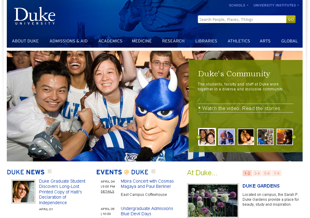 Or https://www.duke.edu. Duke University’s information technology units have historically followed a decentralized model. As a result, Drupal isn’t “the” CMS at Duke, it’s one of three supported by the central web services team. WordPress and Cascade Server are the other two, and many others can be found across the university as well. That said, however, Drupal is gaining in popularity, and increasingly more division and department websites at Duke are built in Drupal. We also redesigned our institutional homepage in Drupal in the fall of 2009.